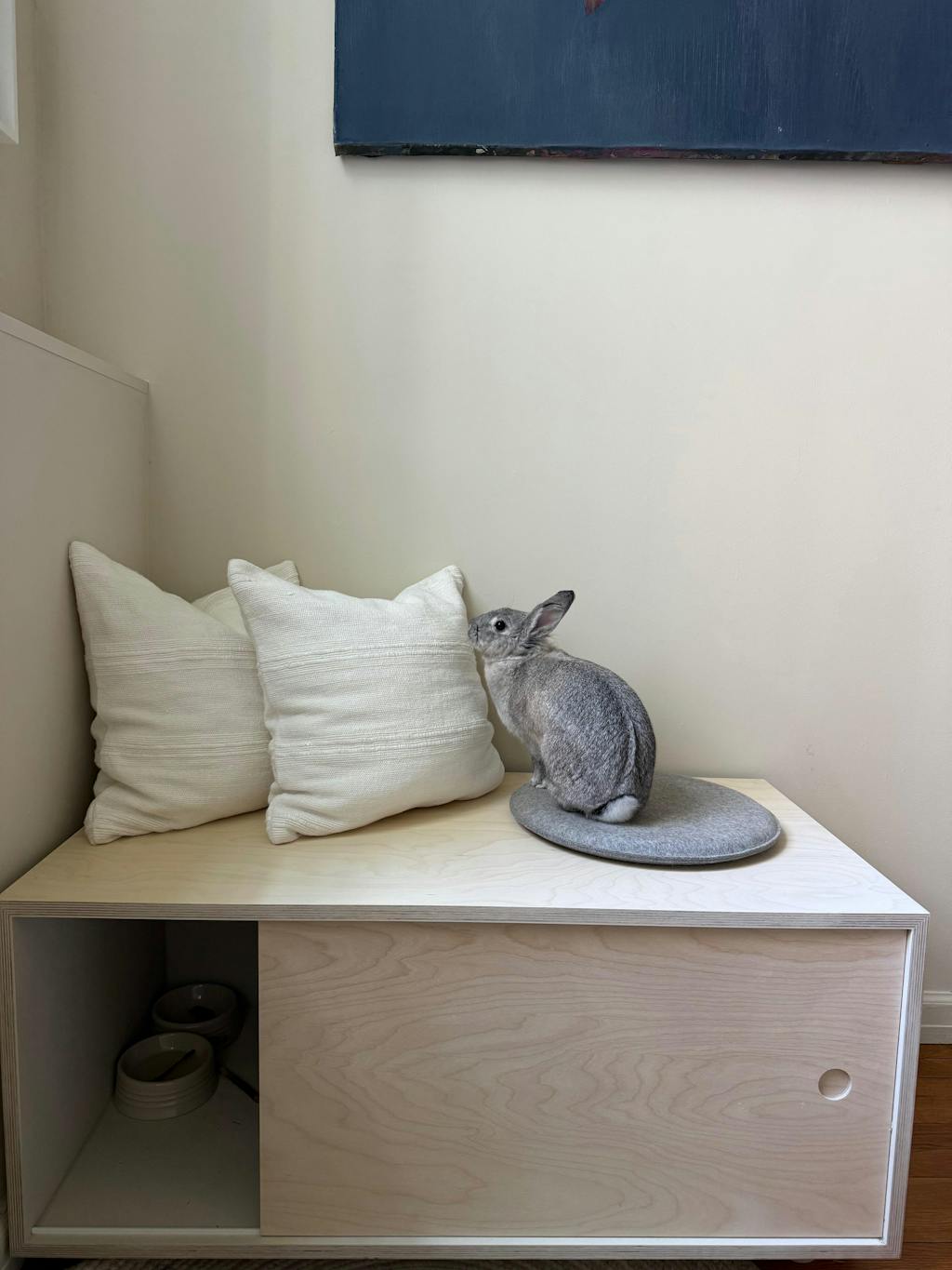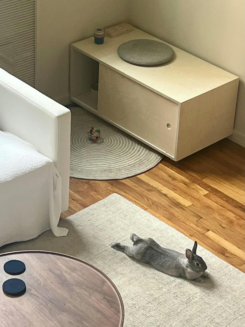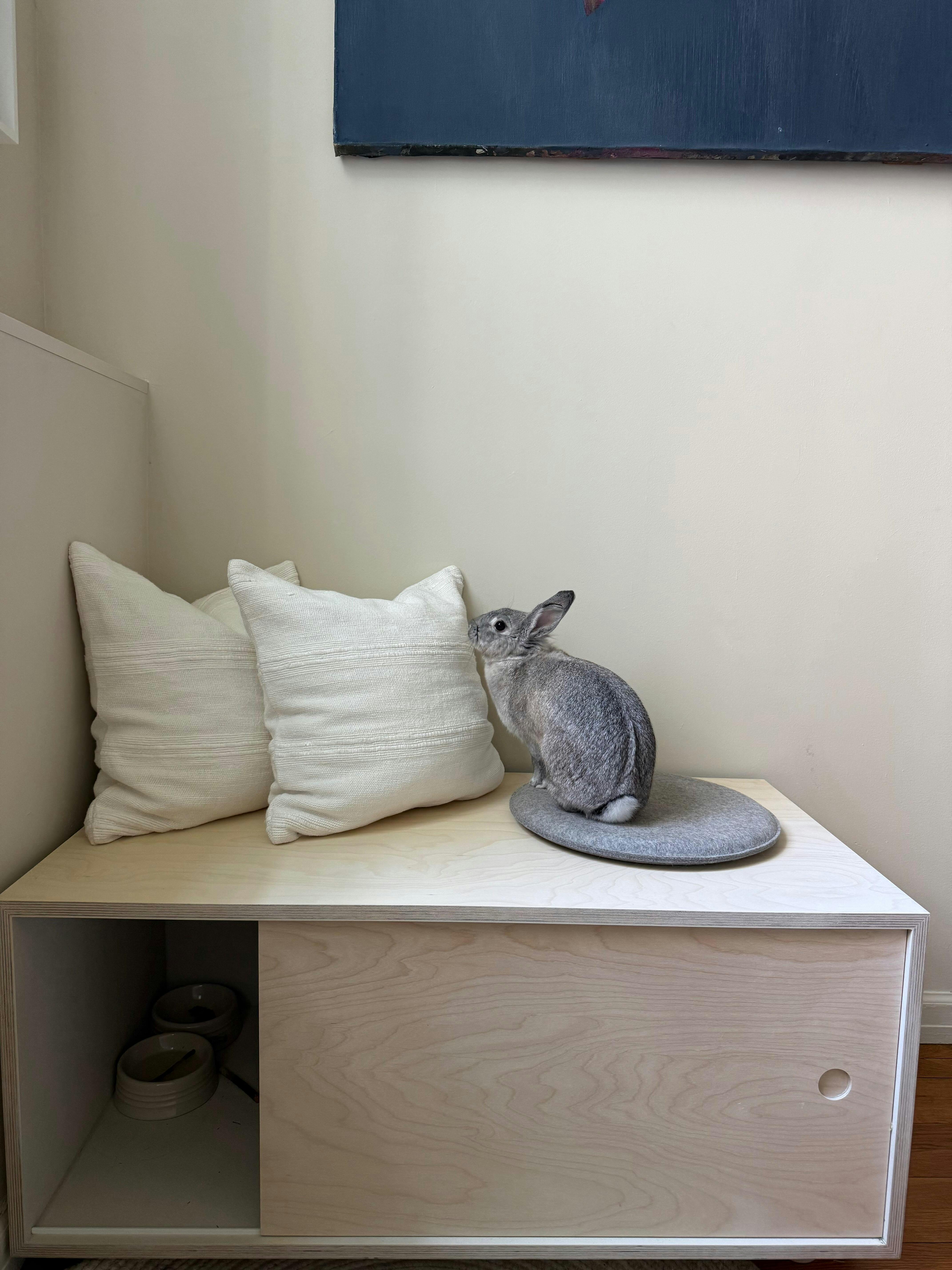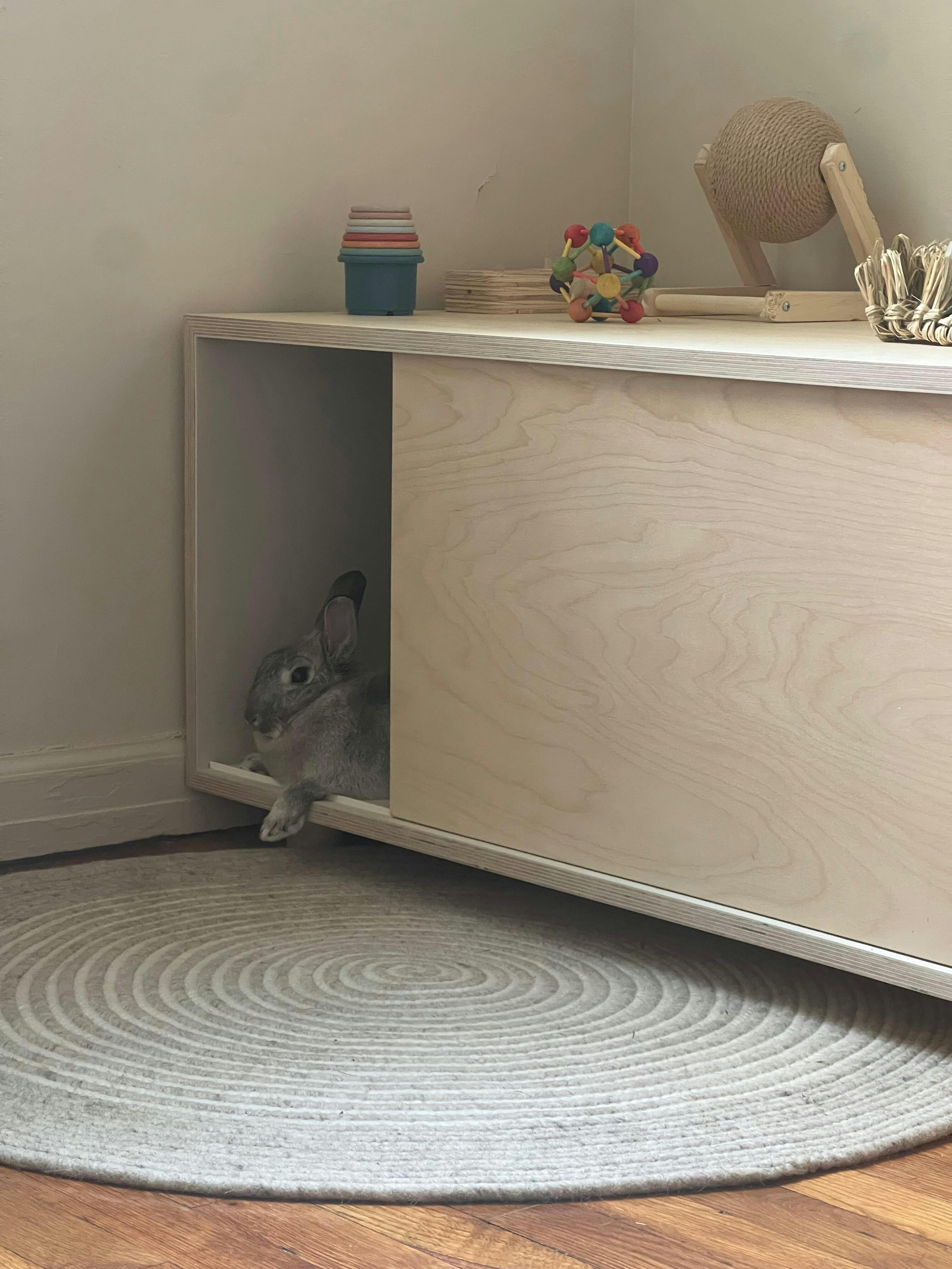 Healthy rabbits need ample room for endless zoomies and binkies, so we designed a unique litter box set-up that seamlessly blends with the largest area of the home—usually the living room. It's a chic alternative to X-pens and NIC grids (intended only for free-roam indoor house rabbits, not a full-time enclosure).